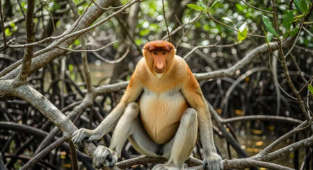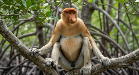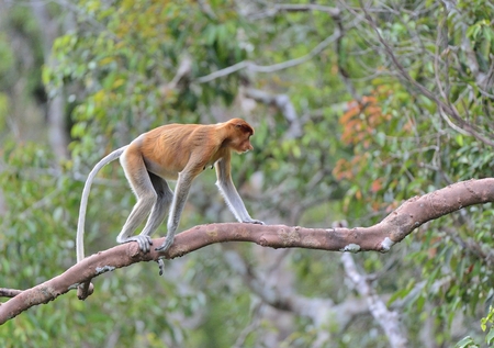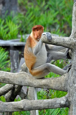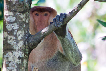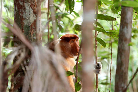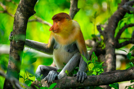 Proboscis monkey sitting on a tree in the national park, Borneo.