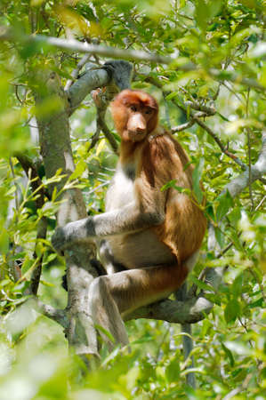 Proboscis Monkey - Nasalis larvatus - in tree in the wild jungles of Borneo. T