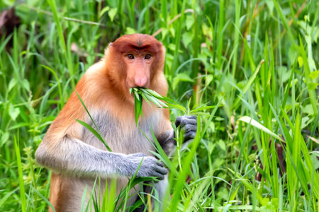 Proboscis monkey Bekantan or nasalis larvatus eating leaves in Tanjung Puting National Park, Indonesia. Kalimantan Borneo Island.