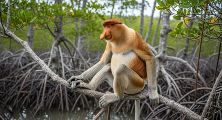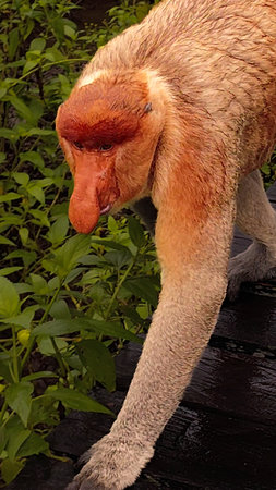 A wild proboscis monkey in Labuk Bay Proboscis Monkey Sanctuary in Sabah, Borneo, Malaysia
