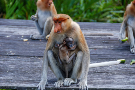 Proboscis Monkey (Nasalis larvatus) with infant baby in Labuk Bay Sandakan