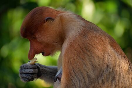 Portrait of a wild Proboscis monkey or Nasalis larvatus, in the rainforest of island Borneo, Malaysia, close up. Amazing monkey with a big nose.