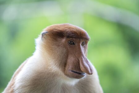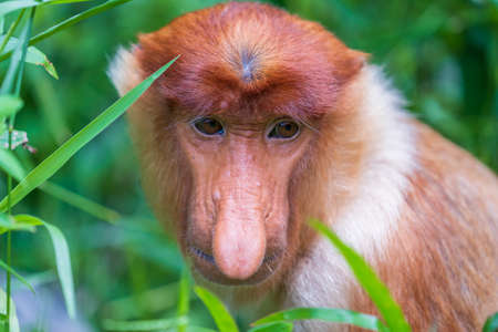 Portrait wild Proboscis monkey or Nasalis larvatus, in the rainforest of island Borneo, Malaysia, close up