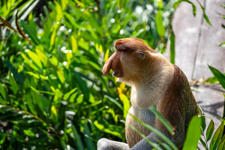 Proboscis Monkey in Borneo rainforest Sandakan Malaysia. Long-nosed monkey. It is endemic to Borneo.