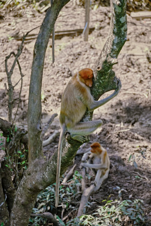 Wild proboscis monkeys (Nasalis larvatus) walking at the famous Labuk Bay Proboscis Monkey Sanctuary in Borneo.