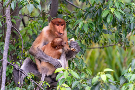 A wild female proboscis monkey with a baby in Labuk Bay Proboscis Monkey Sanctuary in Sabah, Borneo, Malaysia