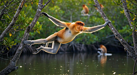 The proboscis monkey is jumping from tree to tree in the jungle. Indonesia. The island of Borneo (Kalimantan). An excellent illustration.