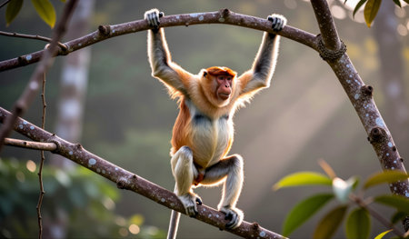 A proboscis monkey is seen skillfully hanging from a branch in a lush forest. Sunlight filters through the trees, creating a warm glow around this agile creature.