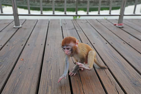 Monkey eats bread. Monkey looks away, sitting on old fence in monkey forest. Wildlife photography. Monkey for banner or visit card. Author's space. Large space for an inscription or logo
