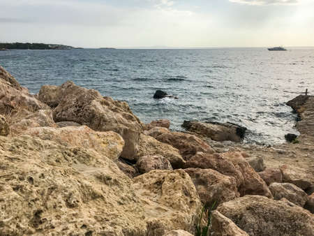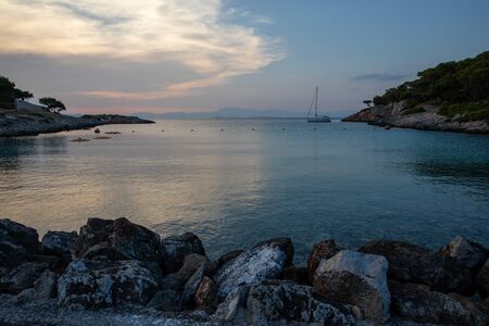 Summertime evening beautiful view from the beach of Aponissos, Agistri island, Saronic gulf, Greece. Horizontal.