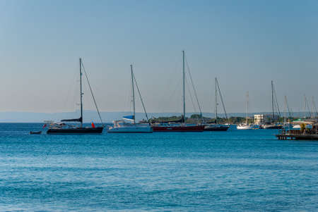 Ships on blue water sea ocean of the harbour in bodrum. Watch from the castle wide angle evening sun. Warm hot summer days. Turkey