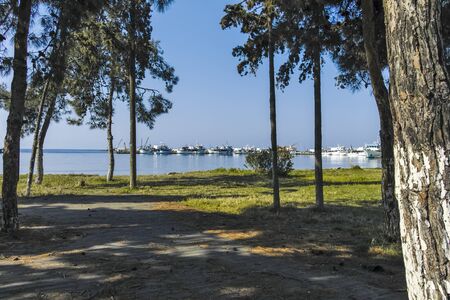 Small tranquil cove with calm blue water. Cozy pine forest along the beautiful bay. Idyllic mediterranean landscape
