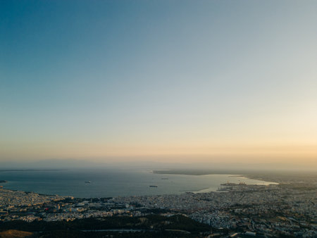 Piraeus city, Attica, beautiful panoramic view of Piraeus, Greece, with harbour and port, mountains and scenery beyond the city, seen from Prophet Helias Hill on Kastela Hill, sunset view