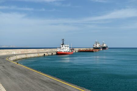 Kissamos, Crete, Greece - May, 26, 2019: A cargo ship Skylark in harbor against a rocky coast of Crete, Greece.