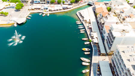 Agios Nikolaos. Crete. Greece. Buildings on the shore of Voulismeni Lake and boats at the pier