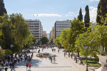ATHENS, GREECE - MAY 2, 2019: The syntagma square with people walking in a beautiful day
