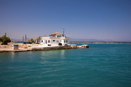 Alexandroupolis, Greece - September 18, 2016: Unidentified people on parking space for ferry terminal on harbor and city view with light house of the city in Eastmacedonia
