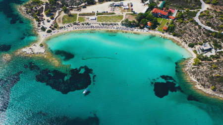 Aerial view of Vourvourou beach, small peninsula in turquoise water of Aegean sea. Waves beating cliff rocky coastline. Halkidiki, Greece.