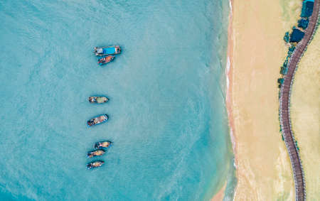 Aerial vertical view of stunning beach with fishing boat, beautiful tropical beach located at Terengganu, Malaysia