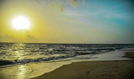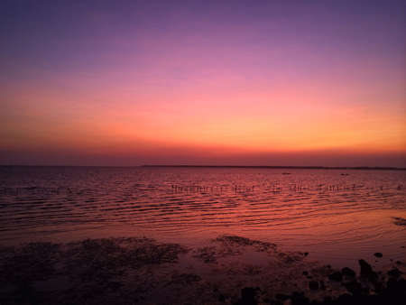 Colorful sea beach sunrise with deep blue and red sky. (selective focus and white balance shifting applied).
