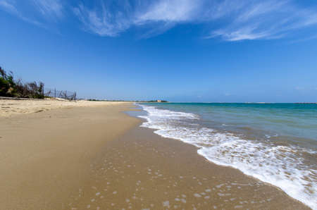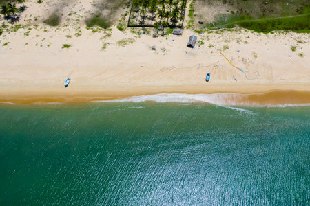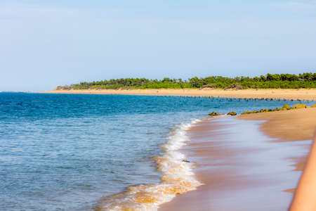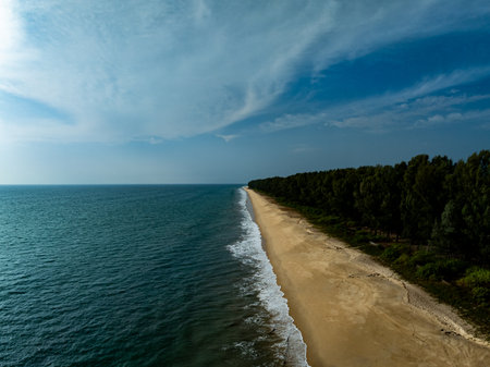 Aerial view of Seascape with tropical sandy beach and blue ocean. Kalpitiya, Sri Lanka.