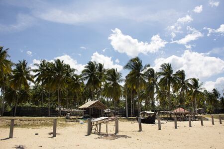 Thatched coconut leaf house or fishing hut on tropical beach. traditional or vintage eco friendly home in a rural village