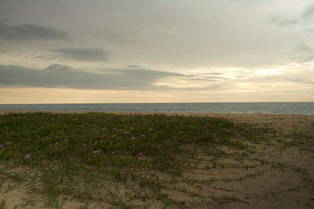 Flowers by the Arabian Sea, view from a beach in Aleppey, India