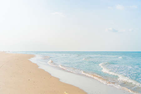 Tropical nature clean beach and white sand in summer with sun light blue sky and bokeh abstract background.