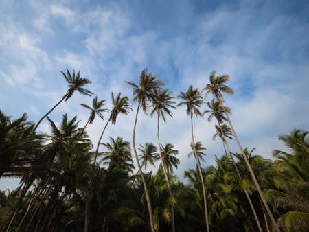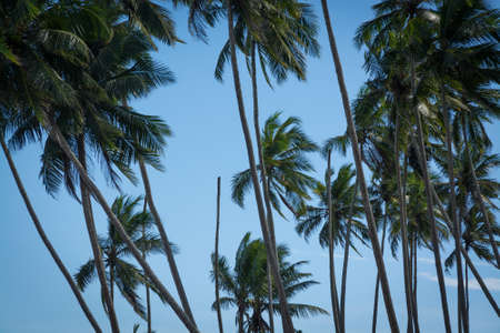 Coconut palms. Coconut palm trees and blue sky. Southern Province, Sri Lanka, Asia.