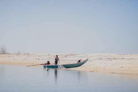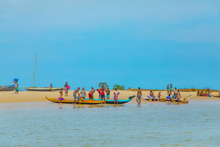 Batavia,western Madagascar, Toliara province.18 october 2023. Inhabitants Madagascar traditional fishing village fold their nets after small catch on ocean shore