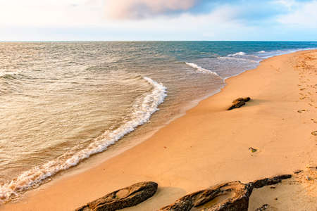 A calm ocean with soft, gentle waves rolling towards a quiet, empty beach at dusk.