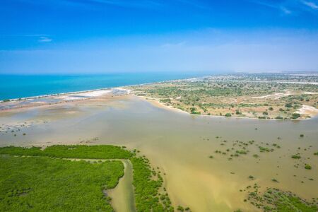 Aerial view of Atlantic coast near Palmarin. Saloum Delta National Park, Joal Fadiout, Senegal. Africa. Photo made by drone from above.