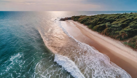 Immerse yourself in the serene beauty of this stunning drone photo showcasing a picturesque beach, with golden sunlight dancing on clear sea waters, vibrant sands, and a breathtaking coastal