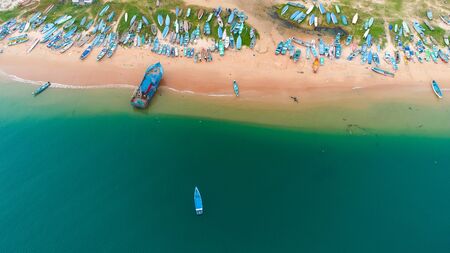 fisherman boat and Vintage wooden boat in sea. Boat drone photo..Aerial view of tropical island beach holiday yacht on blue reef ocean