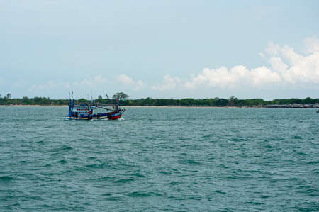 South Indian Beach blue shot from the Pamban Road Bridge of Rameswaram connecting Dhanushkodi, shows the boats sailing towards the shore