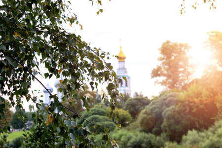 Russian country side village spring time view of orthodox church facade landmark view in green leaves foliage natural frame foreground in clear weather bright day