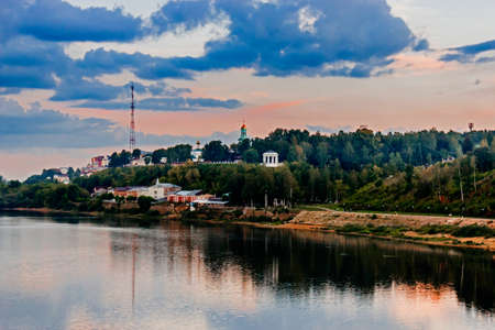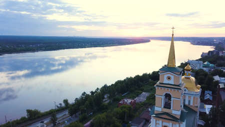 Beautiful landscape of the city in Russia. Clip . A monastery with a river and other houses on the background of sunset.