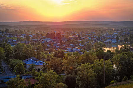 View of the village of Chernoistochinsk Sverdlovsk region from the top of the mountain at sunset