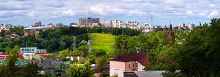 Panoramic view of Grodno city with bridge over the Neman River, historic buildings, and bright summer sky with scattered clouds.