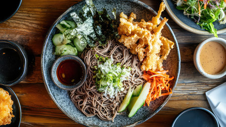 A vibrant Asian noodle dish featuring soba noodles, fresh vegetables, crispy tempura, and flavorful dipping sauce presented in a rustic bowl.