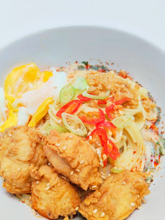 Noodle with fried chicken and egg on white background, Thailand.