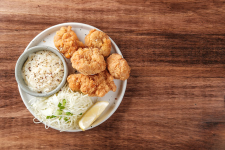 Top View of Karaage Fried Chicken with Sides and Dipping Sauce with copy space for your text.