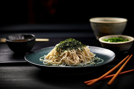 japanese White Noodles in bowl with dry seaweed