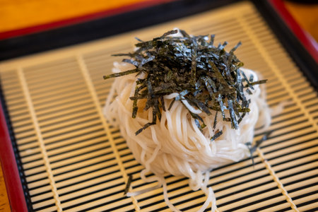Kyoto,Japan - November 14, 2021: Closeup of Zaru soba, chilled noodle dish