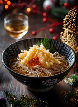 Discover a steaming bowl of soba noodles topped with fresh green onions, paired with crispy tempura, all displayed in a charming Japanese dining atmosphere.