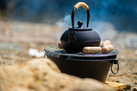 Teapot kettle on bonfire at camp site at night outdoor with flame sparks
