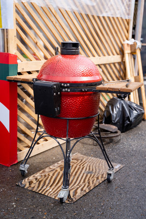 This vibrant red kamado grill, mounted on robust wheels, is a musthave for all BBQ hobbyists, ideal for grilling, smoking, and significantly enhancing outdoor cooking experiences