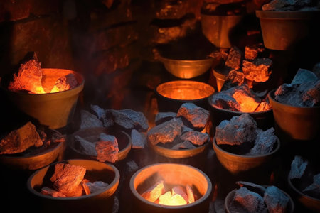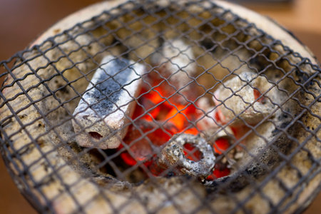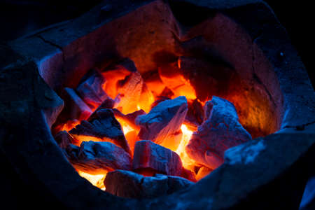 A traditional Asian clay stove, or brazier, is filled with glowing hot charcoal, providing intense heat. A black metal container or mold sits on top, with smoke rising, suggesting a process of cooking, melting, or traditional crafting.
