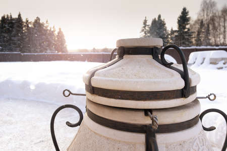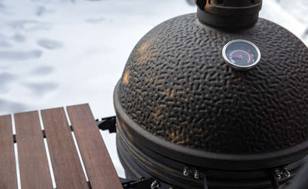 Ceramic tandoor. East ceramic oven for grill, cooking outdoors. Snow landscape around.