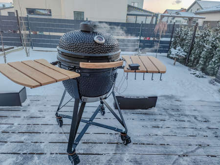 A kamado egg type barbeque grill standing on a living house terrace with wireless thermomether and probes inside the grill and smoke coming from chimney